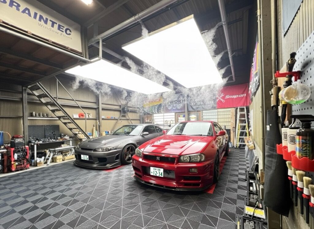 PPFの高品質な施工には欠かせない、大型面発光照明や最新のエアクリーンシステムを大阪のPPF施工店に導入した時の様子です。大型面発光照明を導入すると、ボディの形状や塗膜の状態が非常に見やすくなります。エアクリーンシステムを導入すると、空気中の埃を天井から降り注ぐミストで強制的に除去、高品質で綺麗なPPF施工が可能になります。逆にこの設備が無いと綺麗な施工は難しくなります。