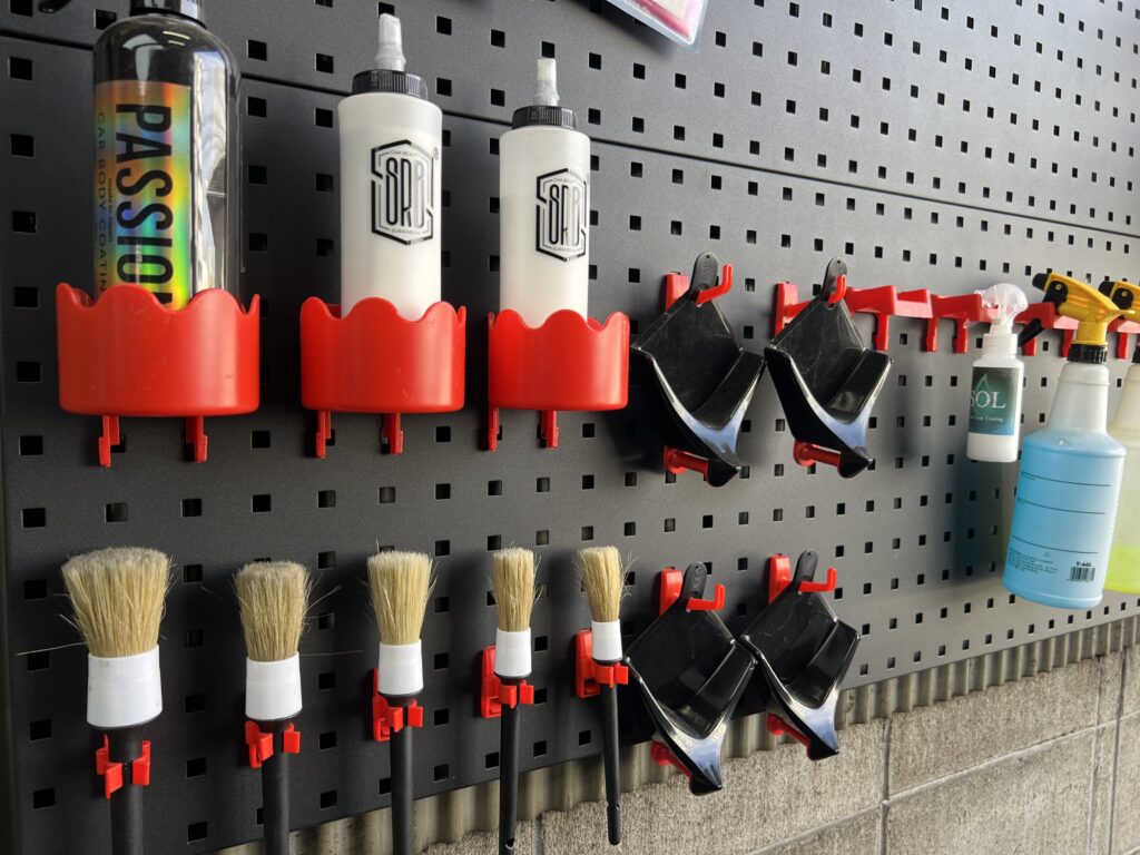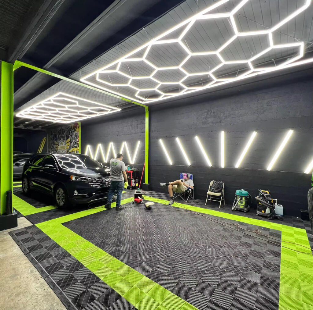 洗車やボディコーティングする時も、こちらのフロアタイルだと水は全てタイル下へ落ちるので足元が濡れない快適な環境で高品質な施工をサポート。カーディテーリングショップ様や、車好きの方には是非導入頂きたい商材です。